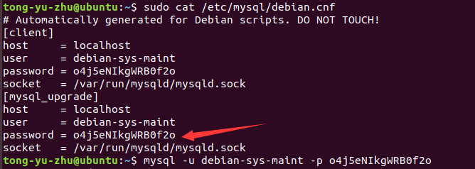 第一步:进入目录:输入:sudo cat /etc/mysql/debian.cnf