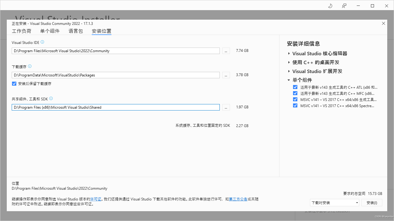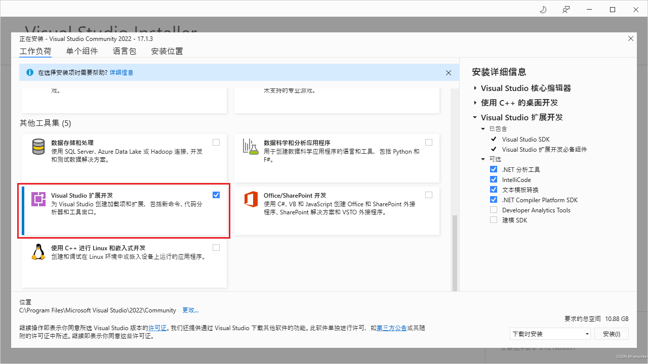 工作负荷下,勾选上使用 C++ 的桌面开发以及Visual Studio 扩展开发,如下图所示: