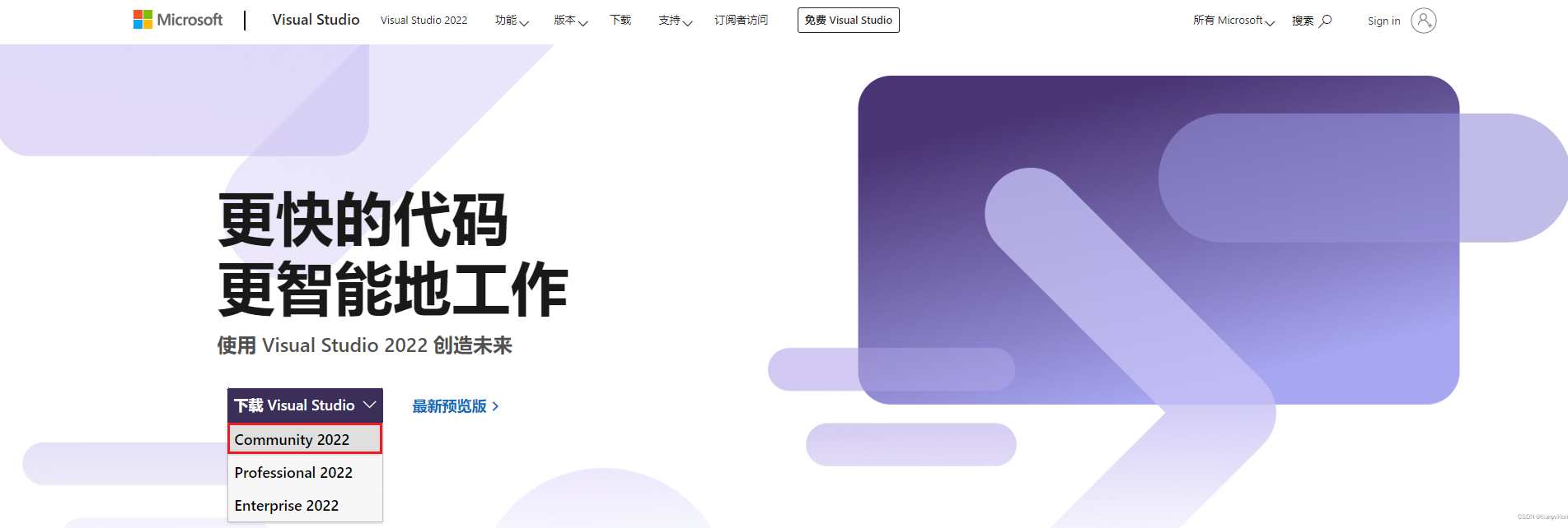 Visual Studio,一般Visual Studio有三个版本,分别是:Community、Professional、Enterprise。这里,推荐大家使用Community,它是免费的,而且能够满足大家的基本需求。如下图所示: