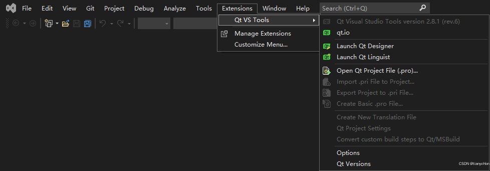 Visual Studio环境配置完成,我们会发现,在Visual Studio中可以打开、新建等Qt操作,如下图所示: