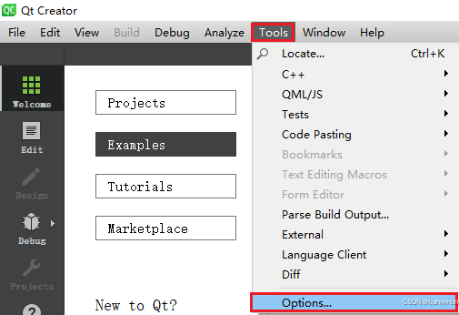 Qt进行配置。打开Qt,单击菜单栏的Tools,然后选中Options...,弹出一个新的窗口,如下图所示: