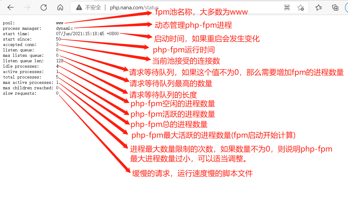 ;pm.status_path = /status # 开启php的状态页面(需要设置Nginx服务的location /status)