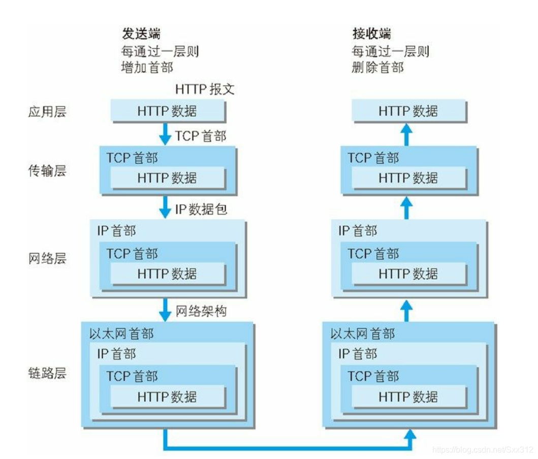 发送端在层与层之间传输数据时,每经过一层必定会被打上一个该层所属的首部信息,反之,在接收端层与层之间传输数据时,每经过一层会把对应的首部消去。