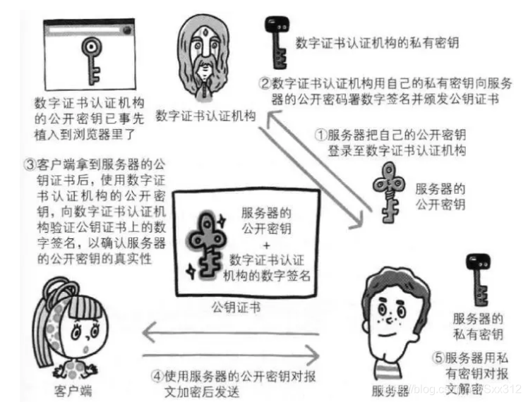为了解决上述问题,可以使用由数字证书认证机构(CA,Certificate Authority)和其他相关颁发的公开密钥证书。虽然HTTP协议无法确定通信方,但如果使用SSL则可以,SSL不仅提供加密处理,而且还使用了一种被称为证书的手段,可用于确定方。
