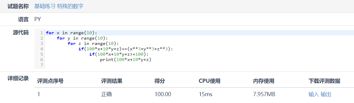 问题描述:153是一个非常特殊的数,它等于它的每位数字的立方和,即153=1*1*1+5*5*5+3*3*3。编程求所有满足这种条件的三位十进制数。