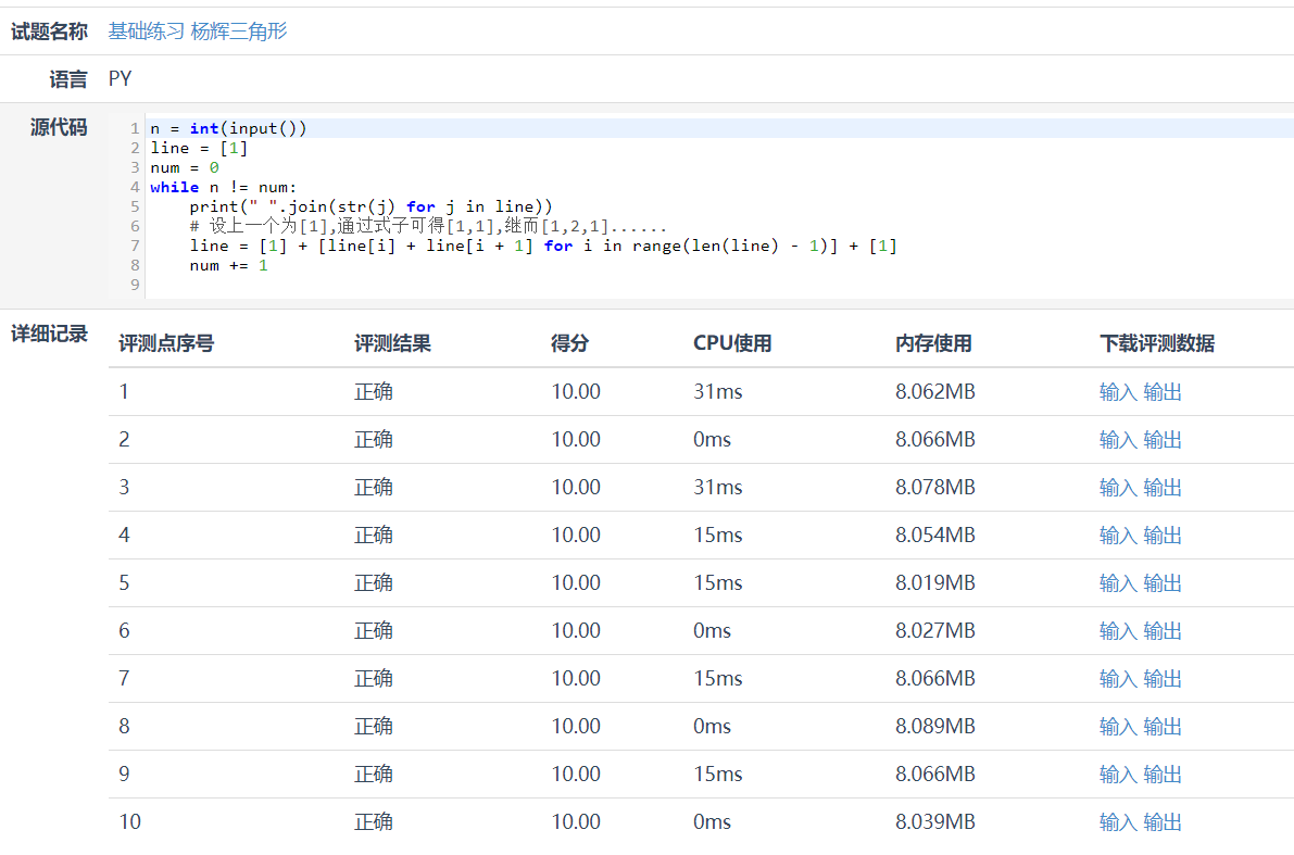 代码二来源:蓝桥杯试题基础练习之杨辉三角形-Python满分解答_zbp_12138的博客-CSDN博客