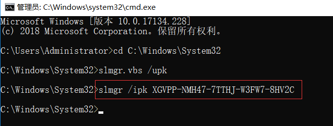 步骤6:再次在命令行中输入slmgr /ipk XGVPP-NMH47-7TTHJ-W3FW7-8HV2C