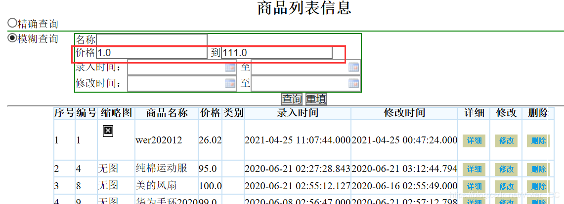 做作业的时候,发现按照价格区间查询数据的时候,一定要把价格两个空都填上才可以,不然就会出现“畸形语法”的错误