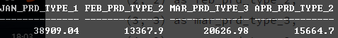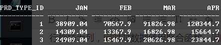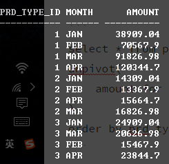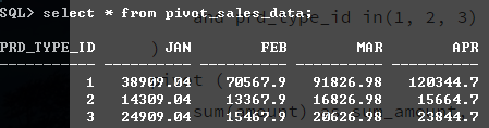 select * from ( select month, prd_type_id, amount from all_sales where year = 2003 and prd_type_id in(1, 2, 3) ) pivot( sum(amount) for month in (1 as JAN, 2 as FEB, 3 as MAR, 4 as APR) ) order by prd_type_id;