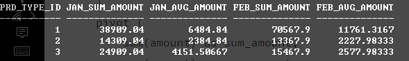 select * from ( select month, prd_type_id, amount from all_sales where year = 2003 and prd_type_id in(1, 2, 3) ) pivot ( sum(amount) as sum_amount, avg(amount) as avg_amount for(month) in( 1 as JAN, 2 as FEB ) ) order by prd_type_id;