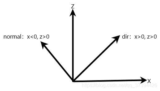 dir:x>0,z<0在第四象限。 normal:a>0,c>0在第一象限