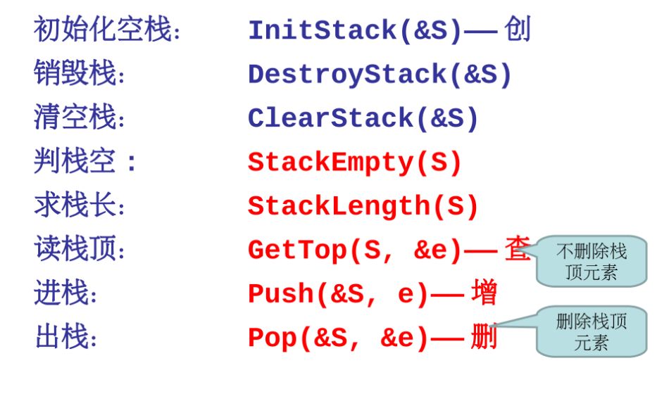 Pop(&S,&x):出栈,若栈S非空,则弹出栈顶元素,并用x返回。(删除栈顶元素)