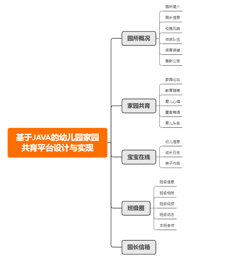 教师、家长、两者之间通过登录网页平台进行互动,平台主要包含园所概况、家园共育、宝宝在线、班级圈、园长信箱5个功能模块;系统管理员可进行信息发布管理、基本维护管理等。
