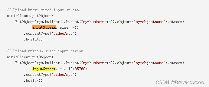 文档中还有很多的API可以使用。上面展示的直接将文件路径传上去作为参数,但是一般的文佳上传都是MultipartFile,可以获得文件流,所以我们可以用输入流进行文件上传,对应的API是putObject;第一个是上传已知大小的文件输入流,第二个是上传未知大小的文件输入流。