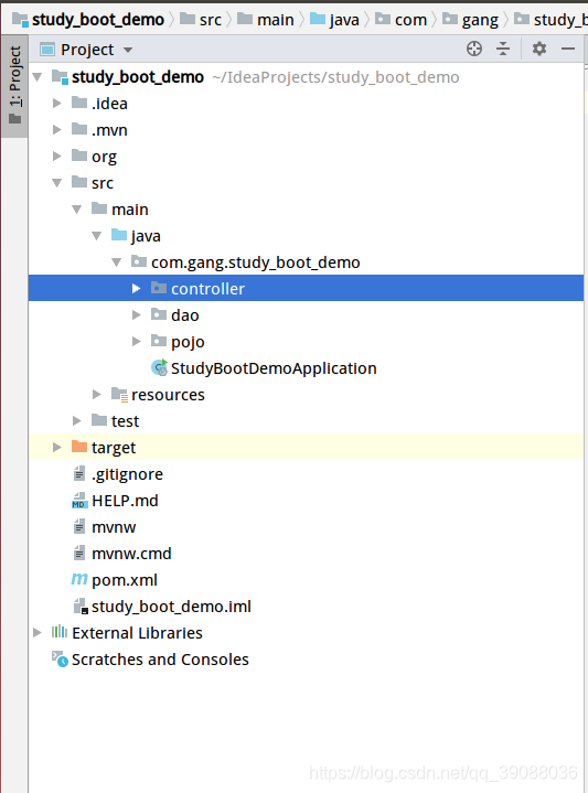 (1)创建Spring boot项目。并创建controller、dao和pojo文件夹。项目目录结构如下: