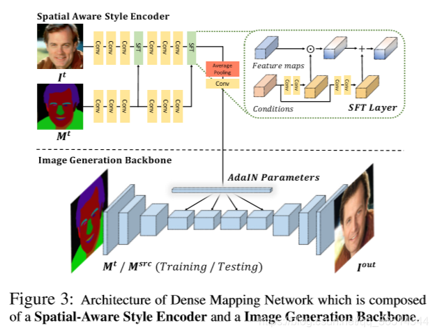 MaskGAN主要由两部分组成:1)密集映射网络和2)编辑行为模拟训练。前者学习语义掩膜和渲染图像之间的映射,后者学习建模用户处理掩膜时的行为。具体来说,密集映射网络由图像生成主干网和空间感知样式编码器组成。空间感知样式编码器以目标图像及其对应的语义标签掩模作为输入;它为图像生成主干生成空间感知样式特征。在接收到用户修改之后的掩膜后,图像生成骨干学习根据空间感知样式特征合成人脸。通过这种方式,我们的密集映射网络能够学习用户修改的掩膜和目标图像之间的细粒度样式映射。