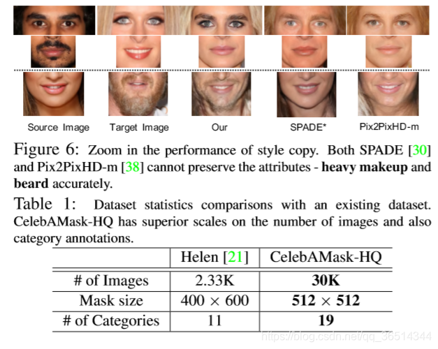 MaskGAN在属性转换和风格复制两个具有挑战性的任务上进行了综合评估,与其他最先进的方法相比,显示出优越的性能。为了便于大规模的研究,我们构建了一个大规模的高分辨率人脸数据集,该数据集带有细粒度的掩膜标签,名为CelebAMask HQ。具体来说,CelebAMask HQ由超过30000张512×512分辨率的人脸图像组成,每张图像都用19个面部组成类别的语义掩膜进行注释,例如眼睛区域、鼻子区域、嘴巴区域。