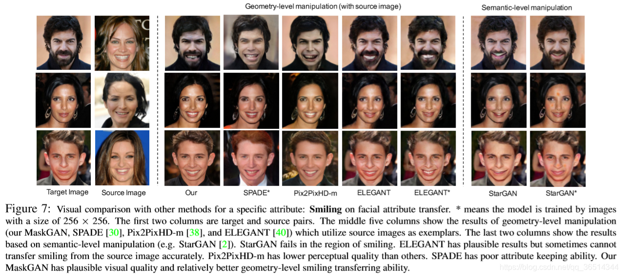 几何层面的人脸操作。最近的一些研究开始讨论从实例层面转移面部特征的可能性。例如,ELEGANT提出通过交换两个人脸的潜在码来交换两个人脸之间的属性。然而,ELEGANT无法准确地从示例中传递属性(例如“微笑”)。对于基于3D的人脸操作,尽管基于3D的方法在正常姿势下取得了令人满意的结果,但是它们通常在计算上是昂贵的,并且在大的和极端的姿势下它们的性能可能会降低。