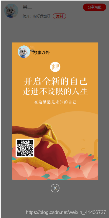 看下效果:点击分享海报后弹出海报,点击X按钮和空白处海报消失的效果