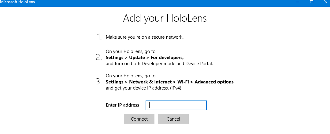 出现下面这个页面,然后需要PC和Hololens在同一个局域网之下.然后输入Hololens的IP地址,点击连接按钮.应该就会显示Hololens的视野了吧.[还没测试过]