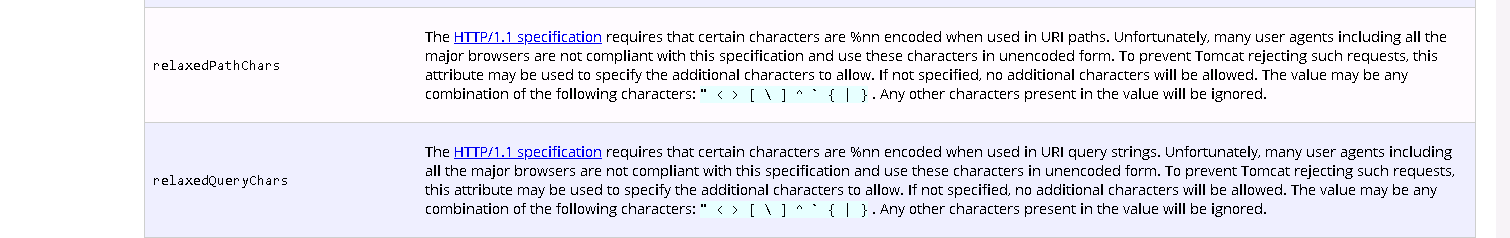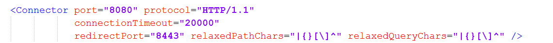 relaxedPathChars="|{}[\]^" relaxedQueryChars="|{}[\]^"