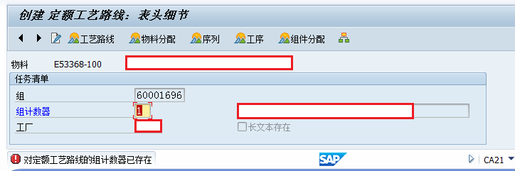 在应用中,遇到有时负责工艺路线维护的人员有意或无意将工艺路线删除后,再次创建时,组计数器号并不会释放的问题。如删除了组计数器号为1的工艺路线,再次新建时,会提示“对工艺路线的组计数器己存在”。如下图所示。这时,对于用户来说,组计数器1相当于没有使用,但却 被占用。虽然使用其它号码也并不影响业务。但对于强迫症来说,这简直不能忍。