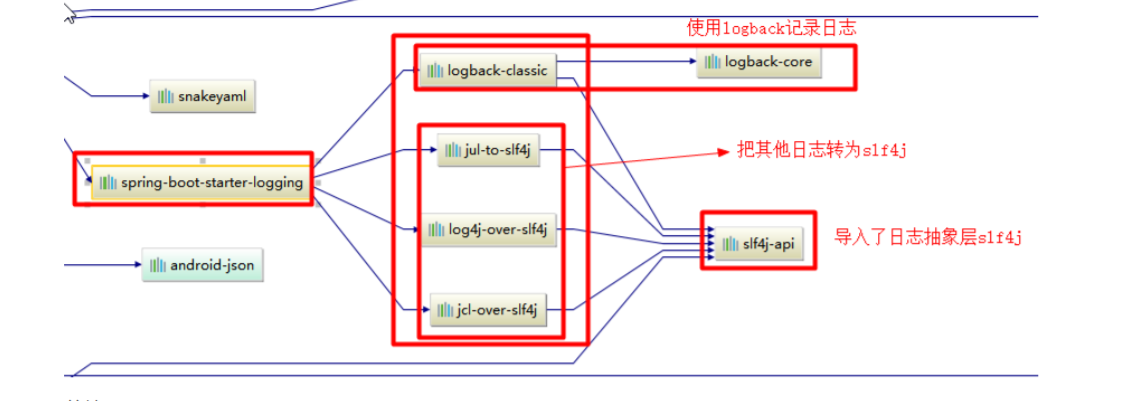 </dependency>SpringBoot能自动适配所有的日志,而且底层使用slf4j+logback的方式记录日志,引入其他框架的时候,只需要 把这个框架依赖的日志框架排除掉即可;