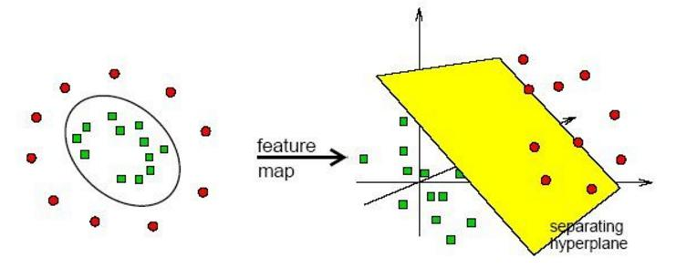 如果我的数据有足够多的可利用的信息,我就能够充分学习这些数据去拟合特定事务的特征了,但是现在如果没有那么多的信息,我们可不可以在数学上进行一些投机呢?比如,我们将数据从低维变换到高维。如下图所示,如果在二维情况下,我们很难通过建模做出分类,因为需要建立一个环去分离数据,但是通过三维变换,我们就能很轻松的用一个平面做出分类。
