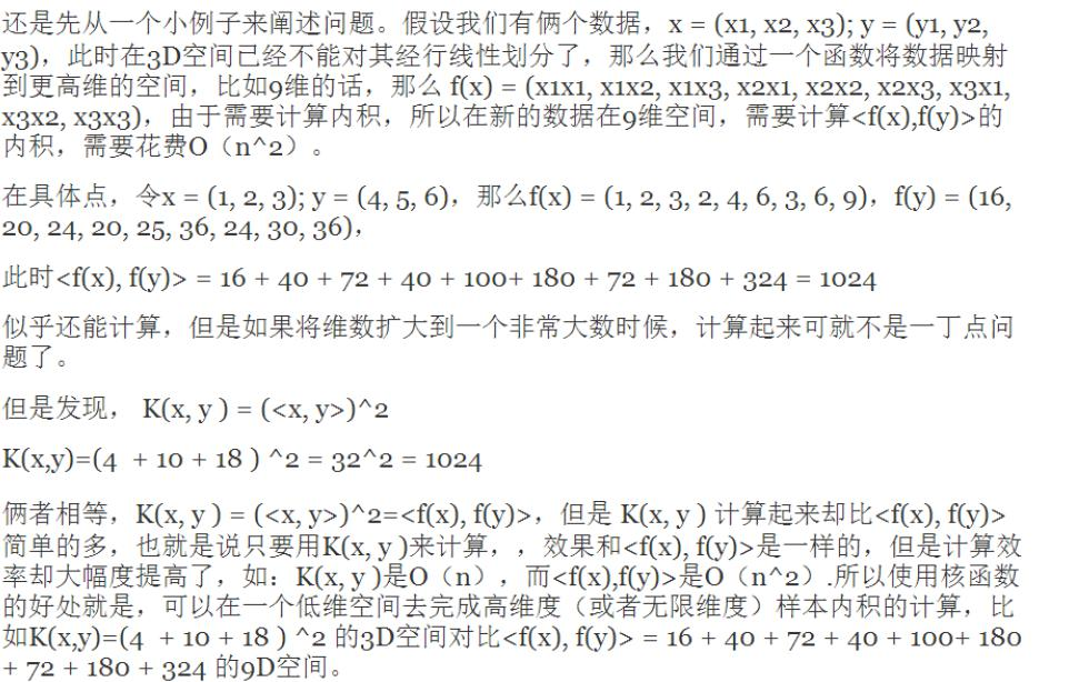 对于核函数,我们真的是先将每个实例映射到高维在做内积吗?很明显,当特征数比较多的时候,运算量十分庞大。我们发现,先做内积在做核函数变换与先做核函数变换再做内积,其结果是一致的,对于运算量,很明显,对一个数做核函数变换的运算量远远小于分别对向量做核函数变换。