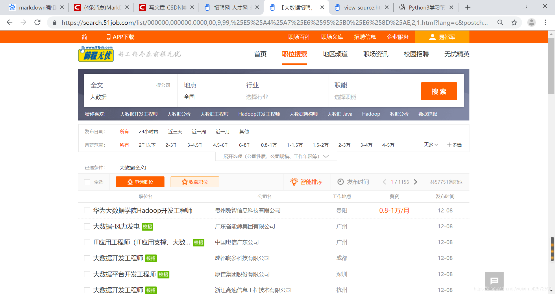 好了,言归正传。本文主要爬取前程无忧大数据类相关职位的一些基本信息:岗位名称、公司名称、工作地点、薪资以及岗位发布时间。对于我们这种新生,爬取这种还是比较有成就感的。