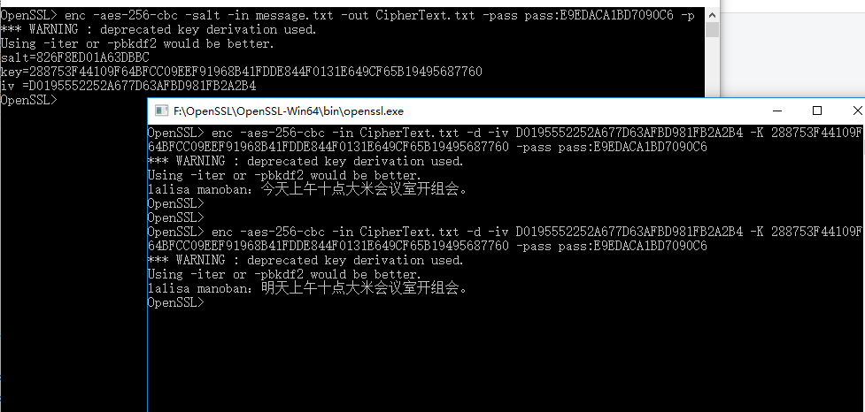 加密后得到的保存着密文的文件CipherText.txt发送给接收方,接收方进行解密,由上图看到,使用两次相同解密指令,初始化向量iv,密钥和口令都相同的情况下,解密出来的内容不相同,这个例子模拟出来一个场景,第一次解密得到的消息是正确的原文,但如果在发送中间消息就被截获和修改,那么使用相同的解密命令,解密出的明文就是第二个,它并不是正确的原文。问题在于,它们都不是一串乱码或意义不明的语句,对于接收方来说,他可能并不知道,解密后的明文,是不是来自发送者,还是来自被中间人截获后修改篡改的消息。为了校验出消息是否被篡改,需要用到消息验证码。
