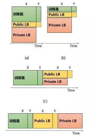 另外,在以下一些情况下,往往 Public LB 反馈亦会提供有用信息,适当地使用这些反馈也许会给你带来优势。如图4所示,(a)和(b)表示数据与时间没有明显的关系(如图像分类),(c)和(d)表示数据随时间变化(如销量预估中的时序序列)。(a)和(b)的区别在于,训练集样本数相对于 Public LB 的量级大小,其中(a)中训练集样本数远超于 Public LB 的样本数,这种情况下基于训练集的 Local Validation 更可靠;而(b)中,训练集数目与 Public LB 相当,这种情况下,可以结合 Public LB 的反馈来指导模型的选择。一种融合的方式是根据 Local Validation 和 Public LB 的样本数目,按比例进行加权。譬如评估标准为正确率,Local Validation 的样本数为 N_l,正确率为 A_l;Public LB 的样本数为 N_p,正确率为 A_p。则可以使用融合后的指标:(N_l * A_l + N_p * A_p)/(N_l + N_p),来进行模型的筛选。对于(c)和(d),由于数据分布跟时间相关,很有必要使用 Public LB 的反馈来进行模型的选择,尤其对于(c)图所示的情况。