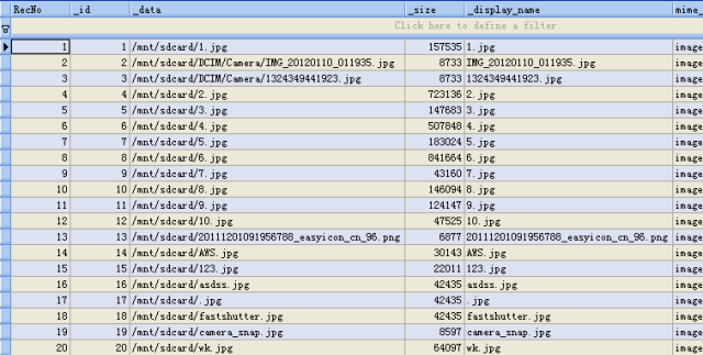 打开external.db文件进一步查看:在media表格下,可以看到文件路径(_data)和Uri的标示ID(_id)的对应关系。