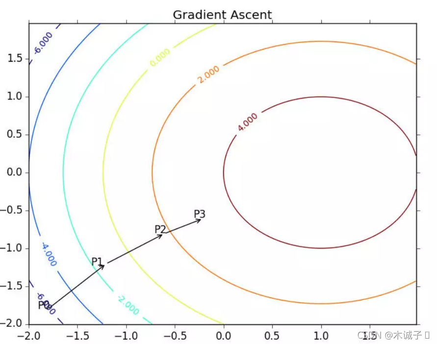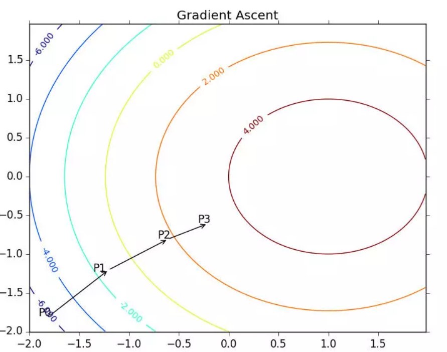 梯度上升算法到达每个点后都会重新估计移动的方向。从P0开始,计算完该点的梯度,函数就根据梯度移动到下一点P1。在P1点,梯度再次被重新计算,并沿新的梯度方向移动到P2.如此循环迭代,知道满足通知条件。迭代的过程中,梯度算子总是保证我们能选取到最佳的移动方向
