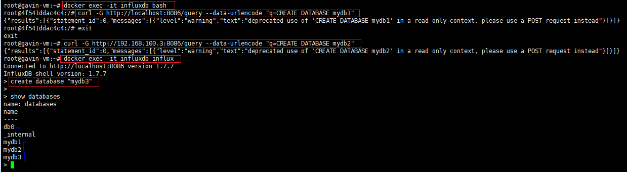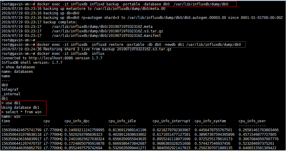 docker exec -it influxdb influxd restore -portable -db db0 -newdb db1 /tmp/db0 #还原到新的数据库db1, 这里省略了拷贝到容器的步骤