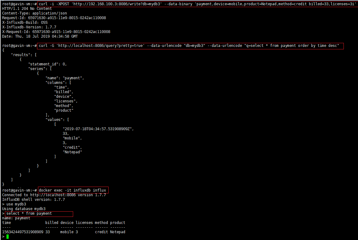 curl -i -XPOST 'http://192.168.100.3:8086/write?db=mydb3' --data-binary 'payment,device=mobile,product=Notepad,method=credit billed=33,licenses=3i'