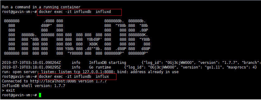 注意进入容器的指令是docker exec -it influxdb influx 而不是docker exec -it influxdb influxd我在还原数据库 就多输入了一个d字符 老提示listen tcp 127.0.0.1:8088: bind: address already in use还找了很多解决方法https://stackoverflow.com/questions/40844762/influxdb-port-8088