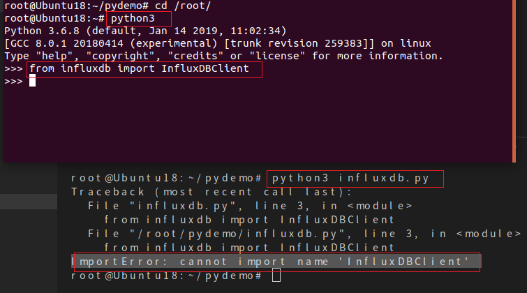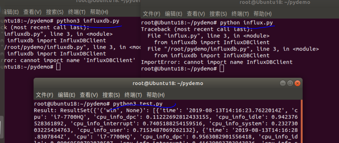 注意上面python操作influxdb的文件而命名不能包含influxxxx.py; 我第一次命名比较随意,但是这次新搭建环境命名叫influxdb.py,结果程序在运行时提示 ImportError: cannot import name 'InfluxDBClient', 参考influxdb-python结果还是失败
