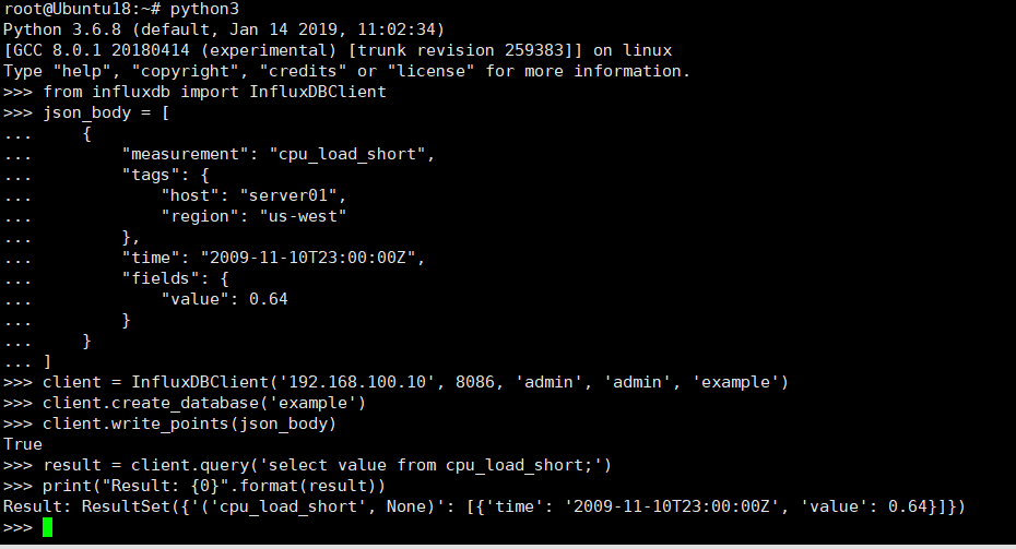 python参考https://influxdb-python.readthedocs.io/en/latest/examples.html 和https://zhuanlan.zhihu.com/p/37523795