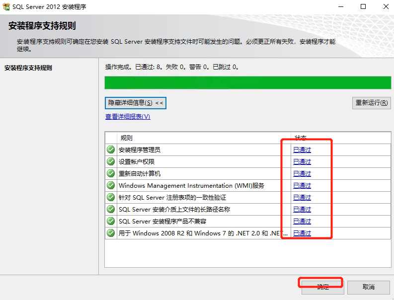 6. 会检测安装条件,如下图所示,通过即可,点击确定