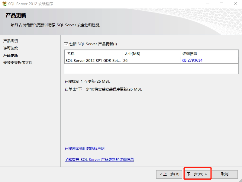 9. 我们看到一个产品更新,这个会下载安装数据库需要的一些文件,服务器需要联外网才行,默认点击下一步,如下图所示