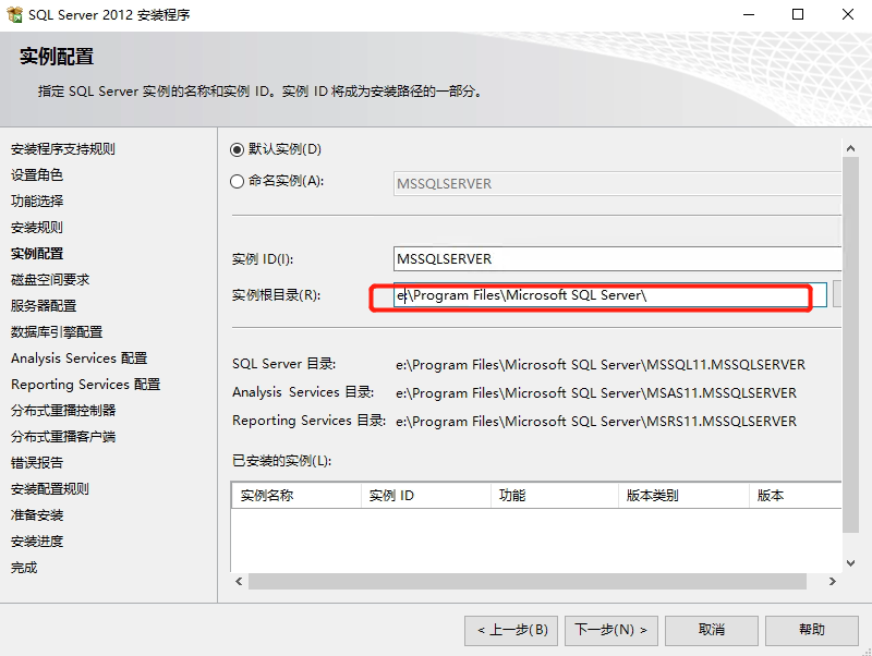 14. 实例配置选择默认实例,安装到非C盘的其它盘符,点击下一步,如下图所示