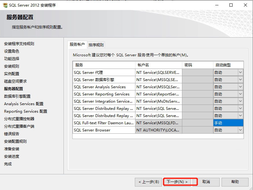 16. 我们可以看到服务器配置,把手动或者禁用的全部改成自动,点击下一步,如下图所示