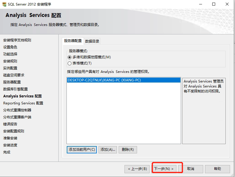 17. 选择混合模式,输入迅软sa的密码,点击添加当前用户,点击下一步,如下图所示