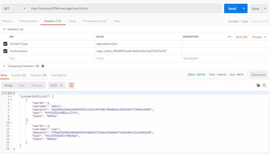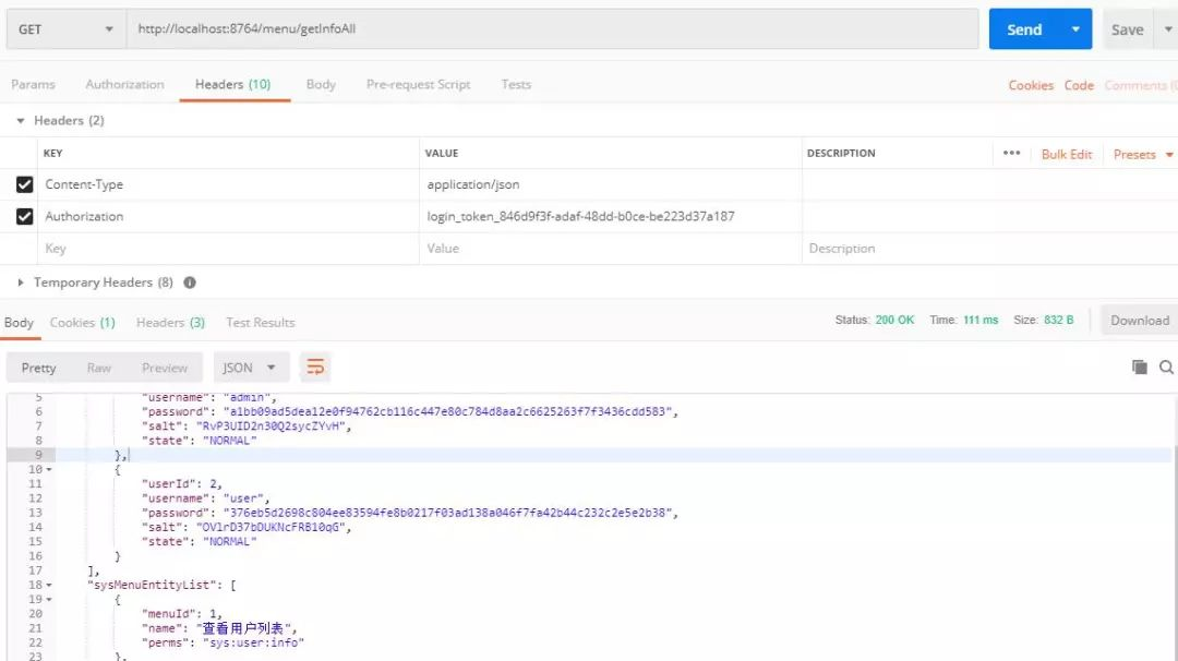 再次访问getInfoAll接口,因为缓存中没有数据,Shiro会重新授权查询权限,拦截通过