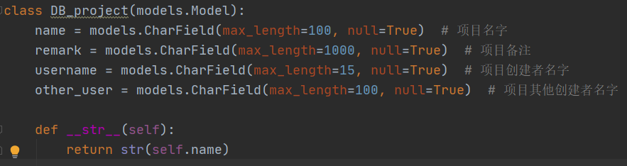 name = models.CharField(max_length=100, null=True) # 项目名字