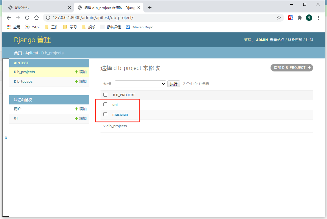 去后台找到这个项目表,手动创建2个项目,以便后续开发前端显示排版做demo用。