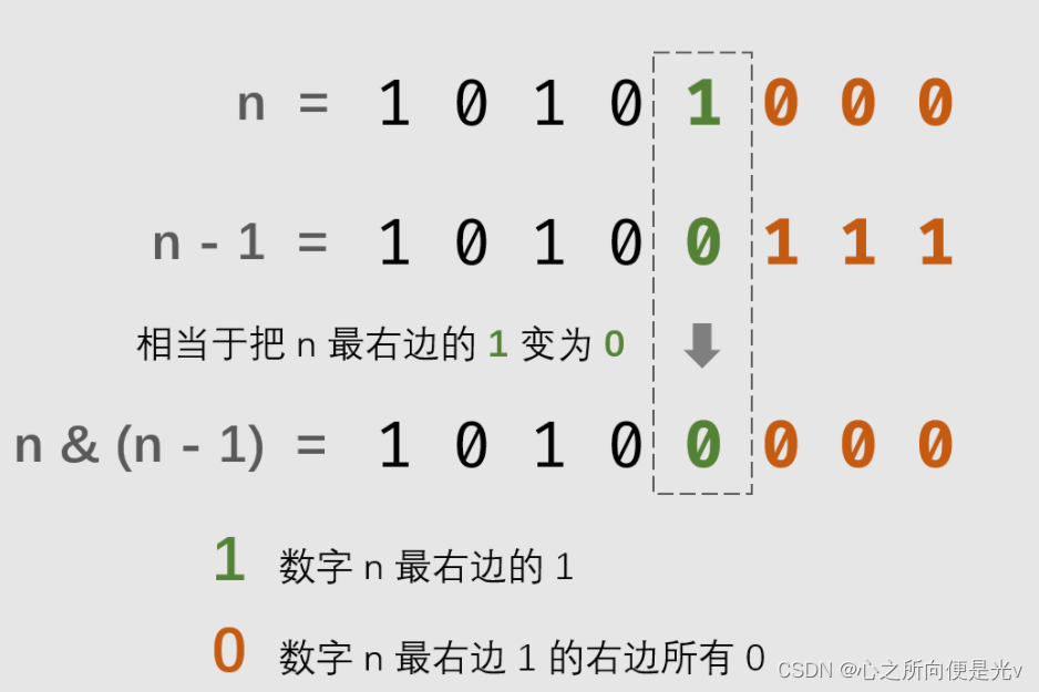 n&(n−1) 解析: 二进制数字 n 最右边的 1 变成 0 ,其余不变。