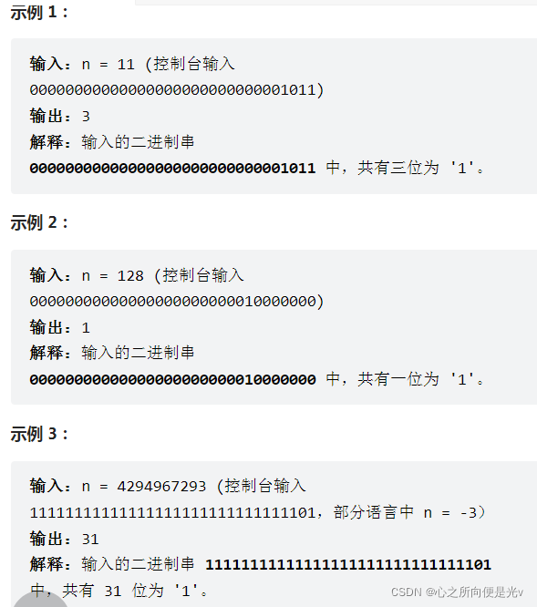 编写一个函数,输入是一个无符号整数(以二进制串的形式),返回其二进制表达式中数字位数为 '1' 的个数。