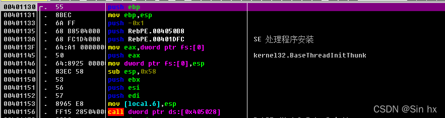 可以看到函数开辟栈帧的操作:push ebp + mov ebp, esp。